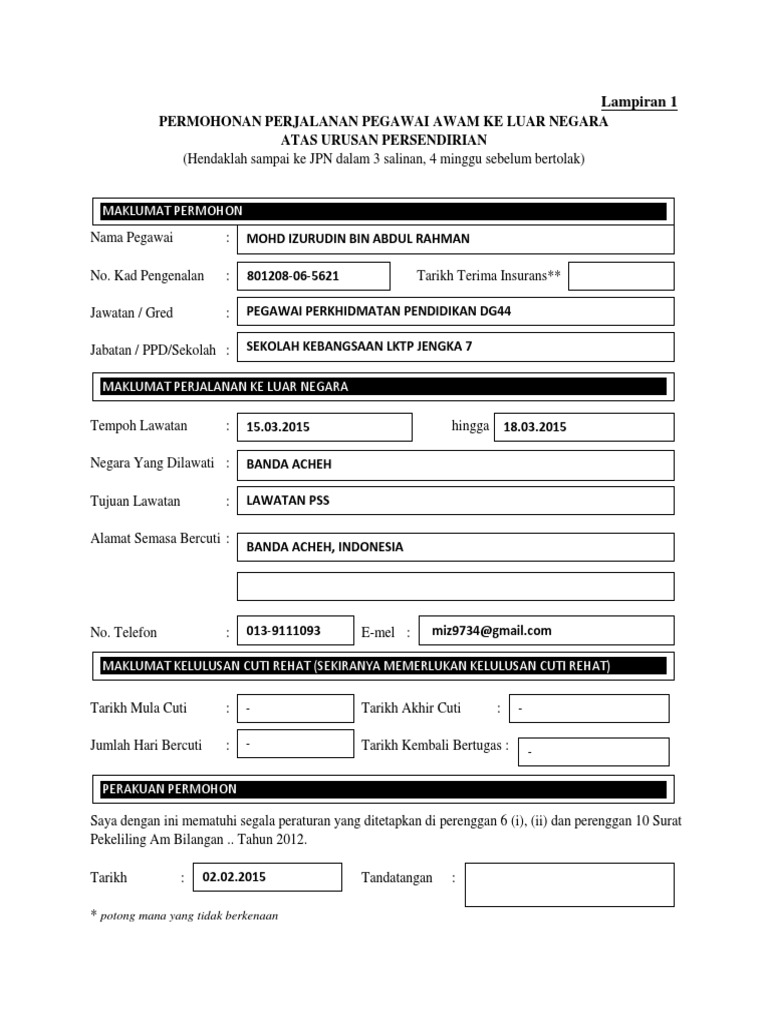 Senarai semak pemeriksaan keselamatan tempat kerja dan healthy setting. Pengesahan rekod maklumat / pergerakan keluar masuk negara dari jabatan imigresen sekiranya tiada maklumat pergerakan keluar masuk daripada negara berkenaan atau negara malaysia. Borang permohonan ke luar negara bagi kakitangan awam cute766. Cek dahulu negara tujuan apakah terjangkau oleh ems (lihat daftar negara tujuan). Contoh borang larangan keluar negeri yang lengkap di isi.